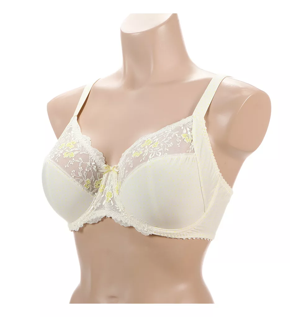 - Wide sheer mesh panel is set into top of cup with pretty floral embroidery.