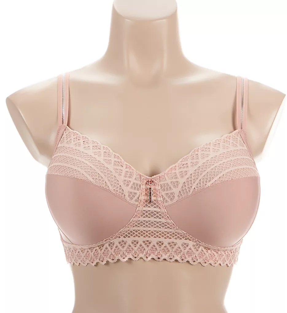 - Wireless, unlined (unpadded), multi-part cups feature seventies’ inspired lace that lies flat under clothing, with opaque lower cups.