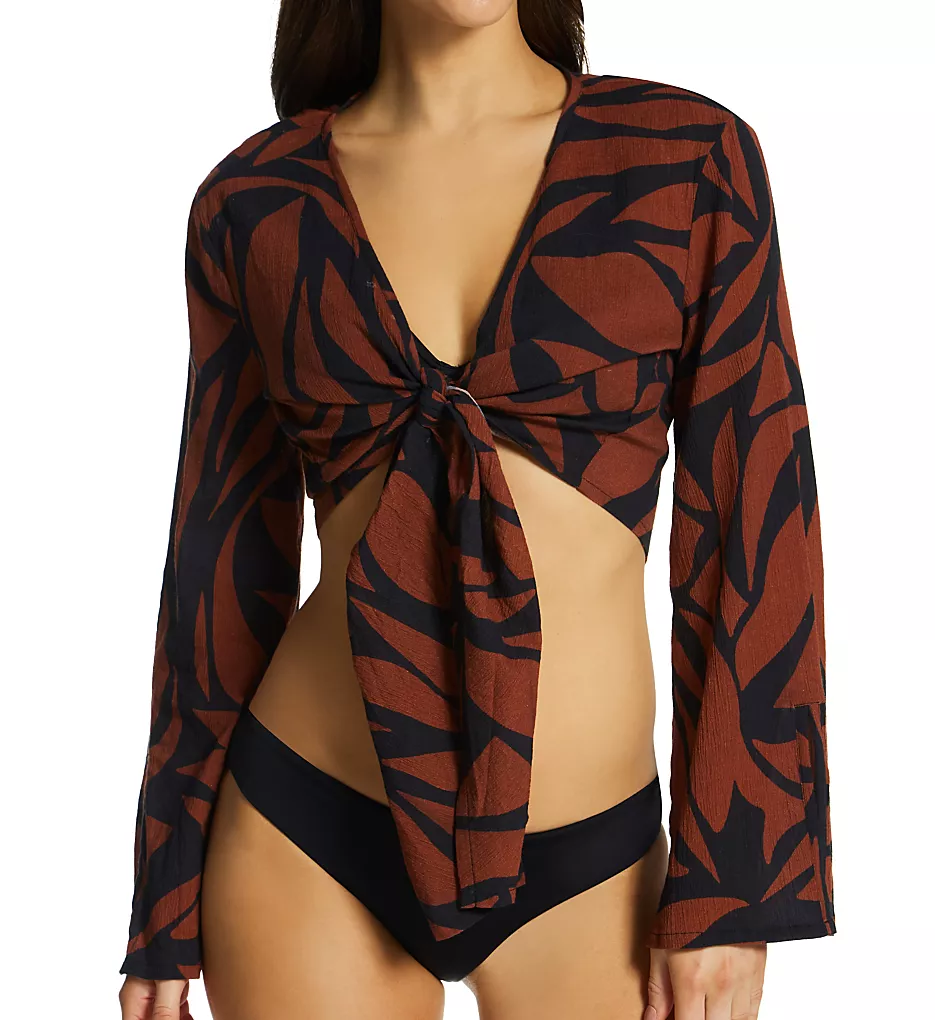 This top features a rich abstract animal-inspired pattern set against a textured, crinkled knit fabric. The center front tie closure allows for a customizable fit, while the elongated flare sleeves provide an elegant, flowy profile perfect for beach layering.