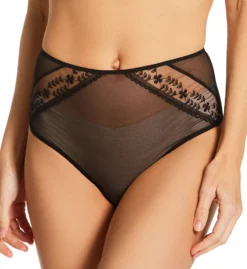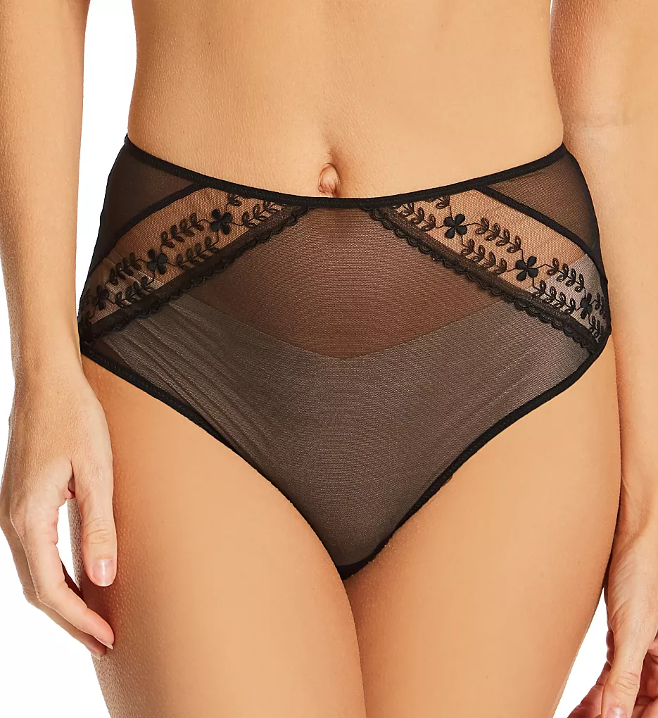 Sheer mesh brief panty rests at the high waist for a flattering style. Embroidered flowers with striped accent are sewn into front sides. Seamed back has ruching for added elegance. Made of polyester, polyamide, elastane, and cotton.