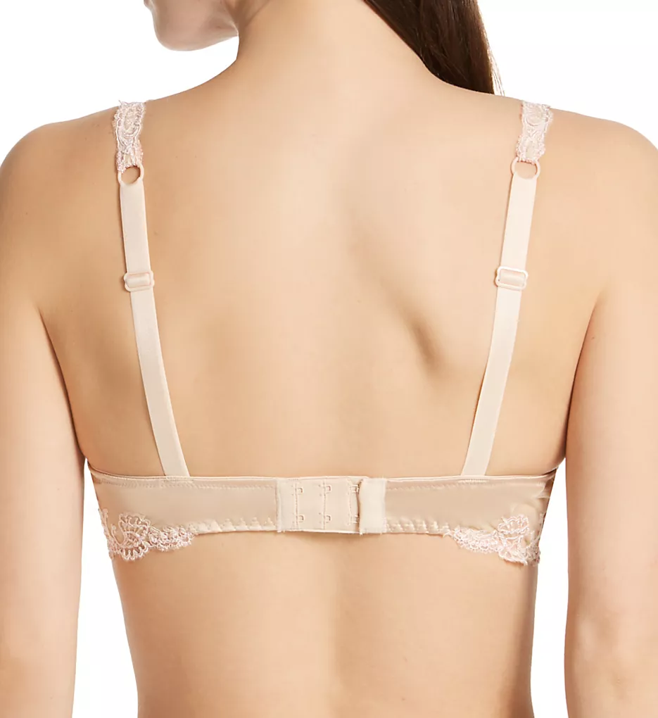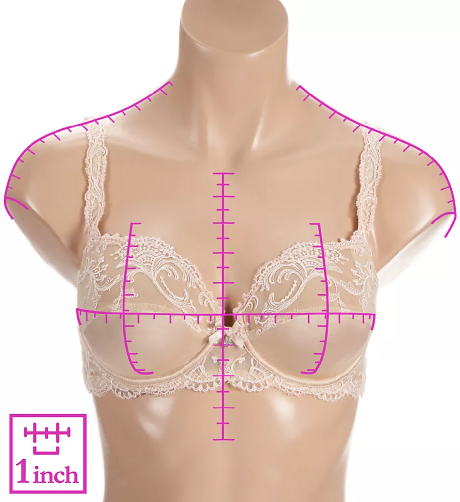 - Underwire cup is unlined (unpadded), and features transversal seaming for shape, with embroidery flourishes on upper mesh panel.