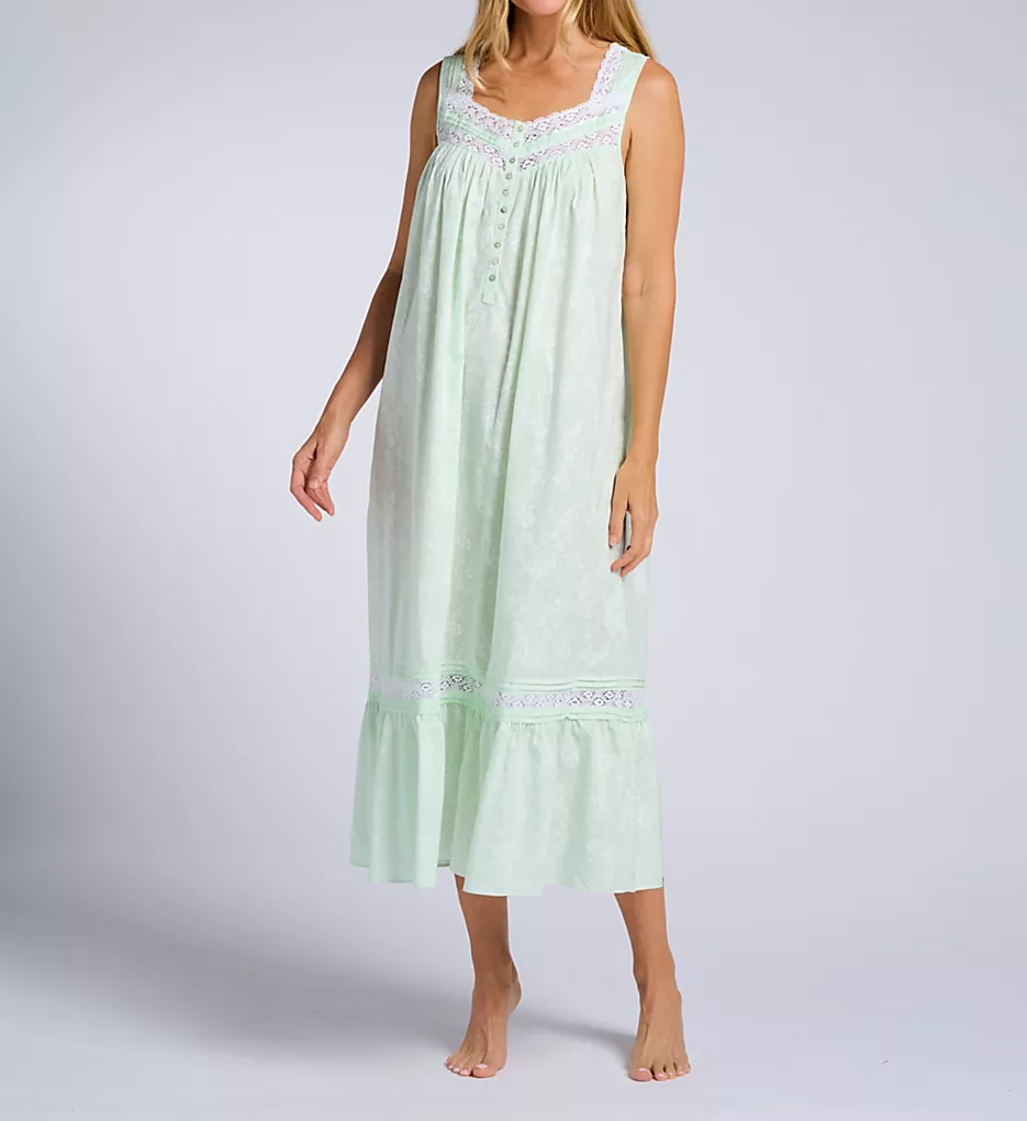 Classic nightgown decorated with pretty lace and pintucks. Made of woven cotton lawn.