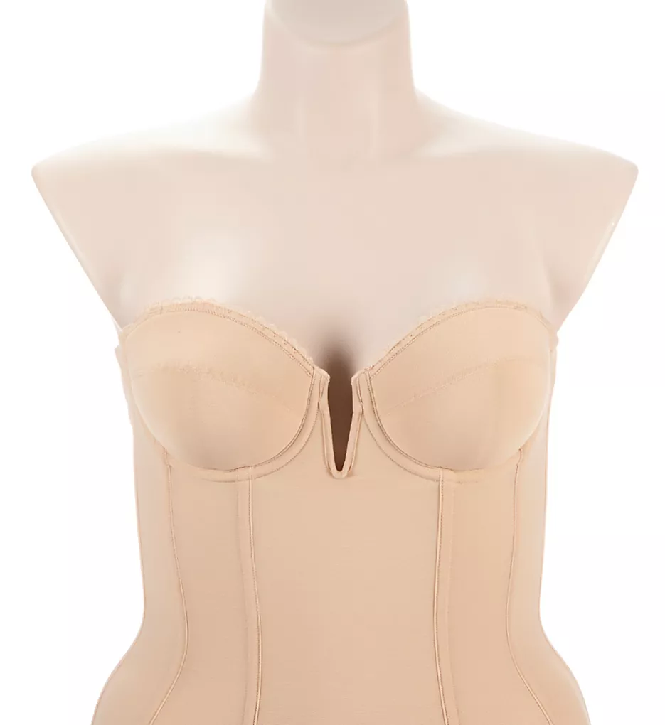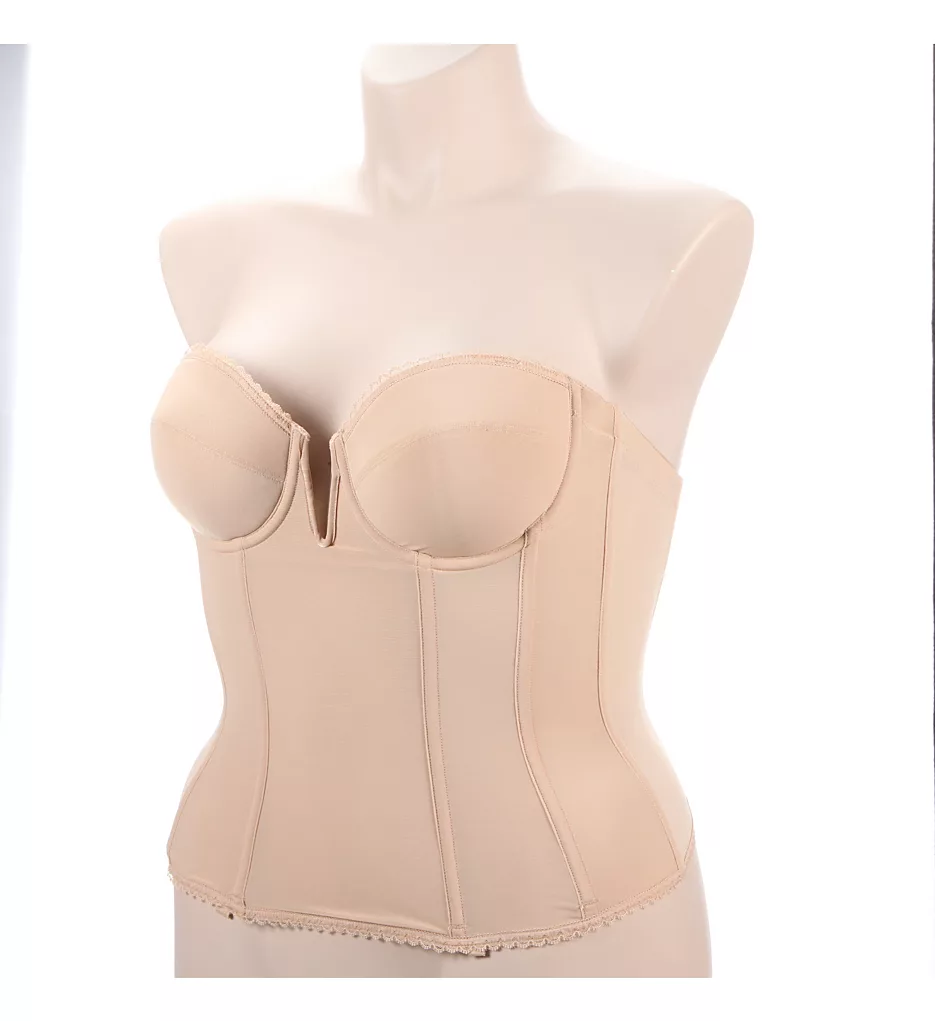 Strapless longline bra is styled with flexible boning and see-through power mesh to give you a more streamlined silhouette. Even comes with removable garters. Made of nylon and spandex.