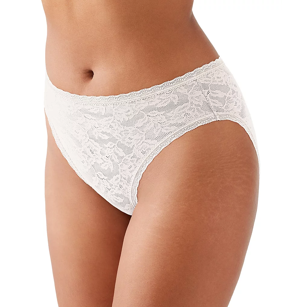 - Scalloped stretch lace trim along outer edges of waist and leg openings holds fit in place.