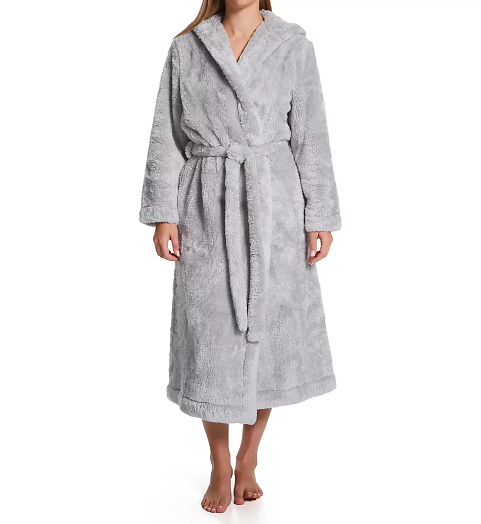 Crafted with a sleek A-line silhouette, this robe boasts a deep charcoal hue with a velvety plush texture that catches the light. The integrated single-seam hood provides extra warmth, while the self-lined cuffs and below-the-knee length offer full-coverage coziness.